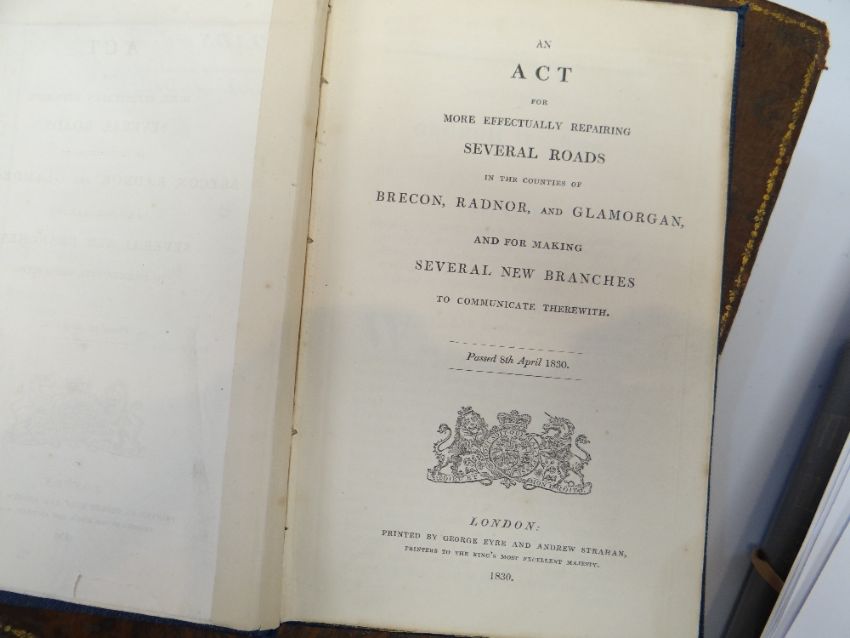 (1)A large hand coloured fold out map of the Breconshire Turnpike Roads,(2) An Act For More Effectually Repairing Several Roads in Brecon, Radnor and Glamorgan. London, 1830. 28 pages. Bound with South Wales Turnpike Roads Proposed Regulations, No date or place. [1844] 23 pages bound with blank leaves one with a page of ms. notes (3) Bound with Glen, William Cunningham: The South Wales Turnpike Road Acts. London, Shaw. 1846. Fold out chart 87 pages. Bound with Single folded leaf printed Parliamentary Act 12 May 1954. 'for extending the Time limited extending the time limited for putting into execution...the act for the better Management and Control of Highways in South. All items Extremely rare(4) Evans, Henry Tobit Rebecca and her Daughters. History of the Rebecca Riots. Educational Publishing Company, Cardiff, 1910. Numbered edition copy is No. 442. The number is written and initialled by the Author. Frontispiece portrait of the author plus folding map, Chronological index, Index of Persons, General Index and List of Subscribers. A very good copy of an uncommon book.The Jeff Towns Collection of Welsh related antiquarian books