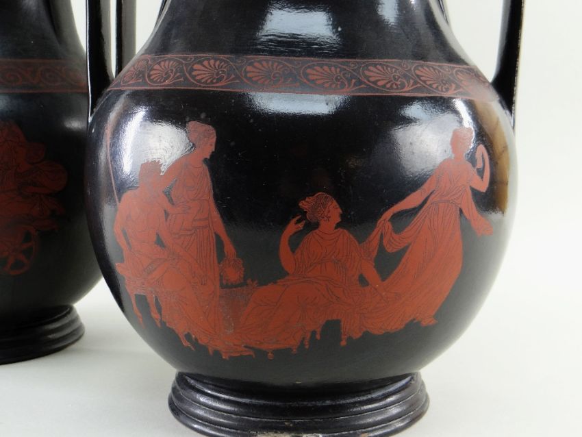 Of Classical Italo-Greek form having twin vertical handles, bellied body, turned neck and foot, the red earthenware body printed in black outline with two robed females in a chariot driven by four frisky horses, opposing side with crowned Greek God with staff and three robed females, printed mark to base reads 'Dillwyn's Etruscan Ware' in scroll cartouche (2)