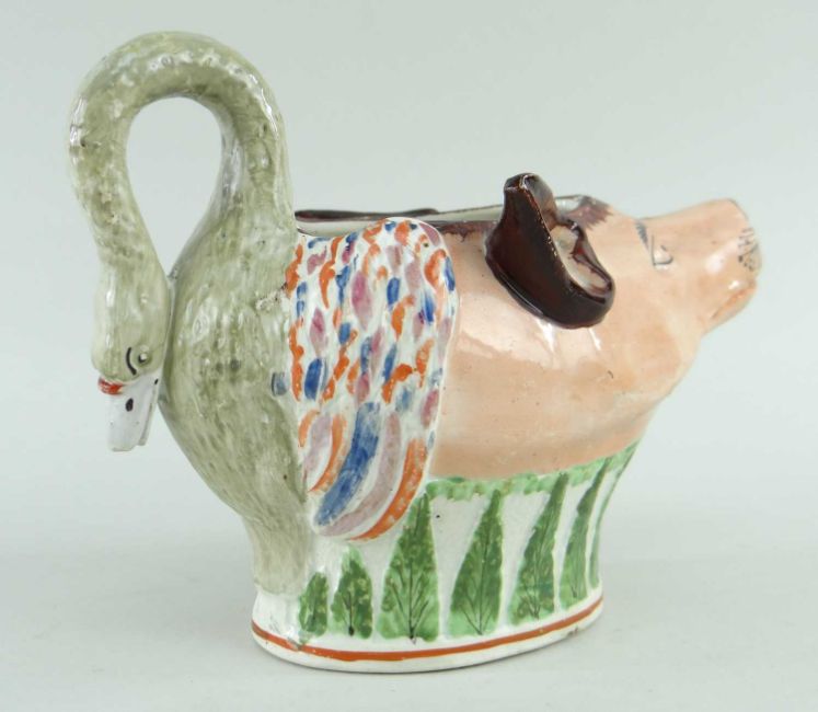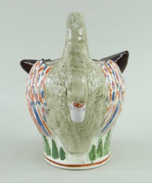 the spout in the form of a fox's head, the handle as a goose with outspread wings, above a band of stiff leaves