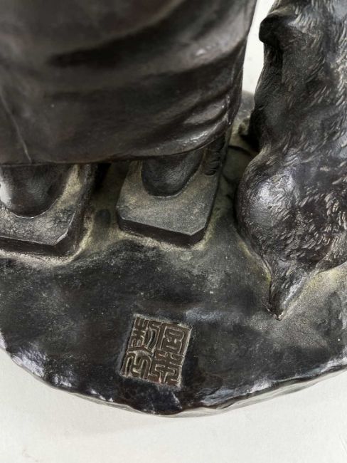 feeding a treat to a puppy, another looking on hopefully at his feet, wearing kimono and geta, base with 4-character mark