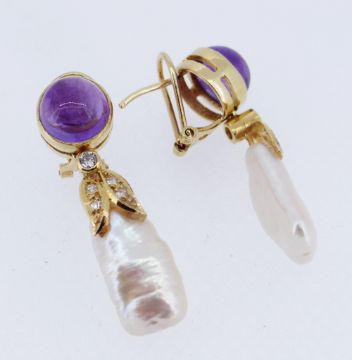 the circular cabochon amethysts above the pearl and diamond accented drops, 12.1gms gross (2)