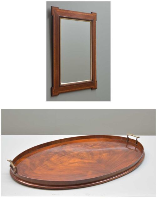 EDWARDIAN MAHOGANY WALL MIRROR & DRINKS TRAY, mirror with satinwood crossbanded border and outset corners, 72.5 x 56cms; tray with raised gallery and gilt metal handles, 67 x 44.5cms (2)