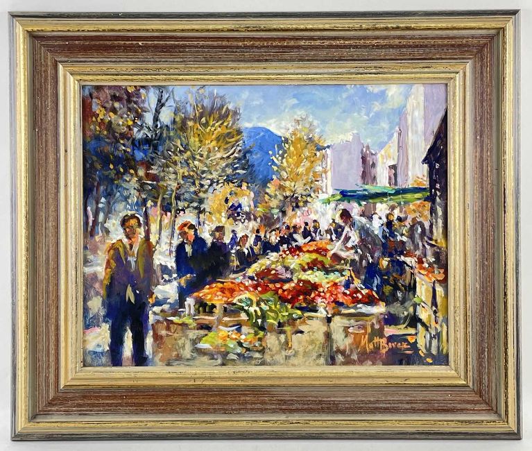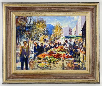 MATT BRUCE, oil on board - Fruit market, signed, 34 x 44cms