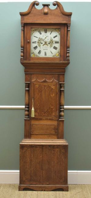 19TH CENTURY ANGLESEY 8-DAY OAK LONGCASE CLOCK, Robert Jones, Amlwch, c. 1835-56, 13in. painted dial decorated with flowering plum spandrels and floral centre, trunk with cushion and reel moulding, box strung details above and below baluster columns, door with scalloped top and inlaid with central oval and fan spandrels, matching the base, low bracket feet, 225cms h