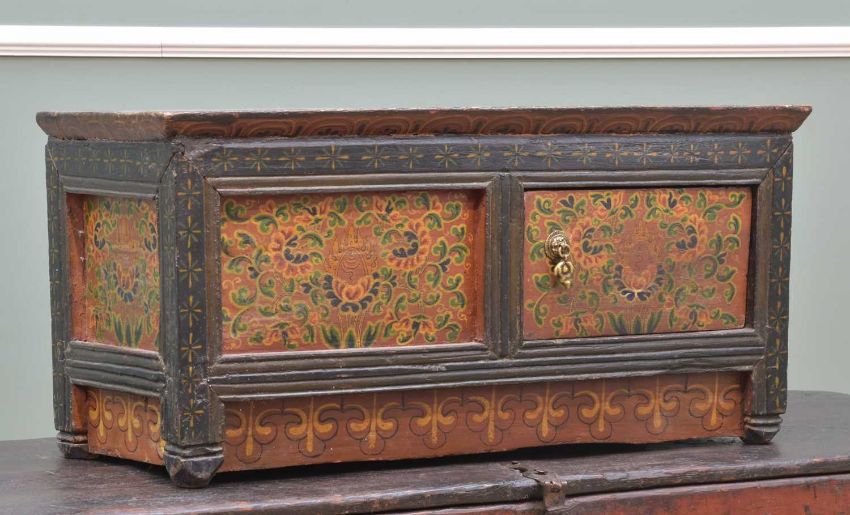 SMALL 18TH CENTURY-STYLE TIBETAN PAINTED & LACQUERED STORAGE CUPBOARD, panels decorated with flaming conch and lotus within scrolling foliate borders, 66w x 28d x 31cms h