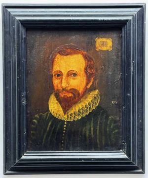 AFTER RICHARD BURBAGE/JOHN TAYLOR and AFTER ISAAC OLIVER (20TH CENTURY) oils on panel - portrait of William Shakespeare, modern copy of the famous 'Chandos' portrait; and portrait of the Elizabethan poet John Donne, modern copy of the famous 1616 miniature, 37 x 28.5cm (a pair)