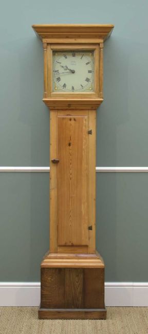LATE 18TH CENTURY & LATER PINE 30-HOUR LONGCASE CLOCK, William Ray, Sudbury, painted 10 1/2in. Roman dial, square hood, plain case, replaced oak base, 191cms highComments: case associated, G.H. Baillie records William Ray of Sudbury from 1762-1790.