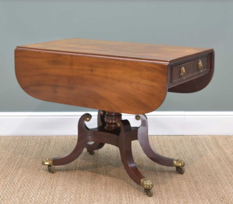 19TH CENTURY MAHOGANY PEMBROKE TABLE, drop flap top above frieze drawer with quatrefoil brass escutcheon, mask ring handles, twist and leaf moulded column on patform base and four splayed legs, paw castors, 106w x 92d x 72cms h