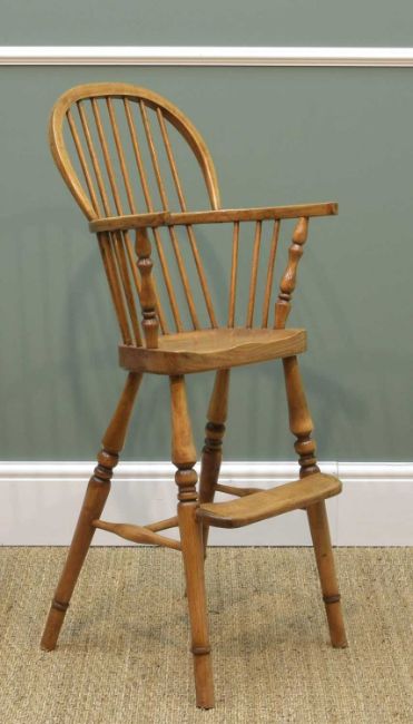 MODERN REPRODUCTION ELM & ASH CHILD'S WINDSOR HIGH CHAIR, 100cms high
