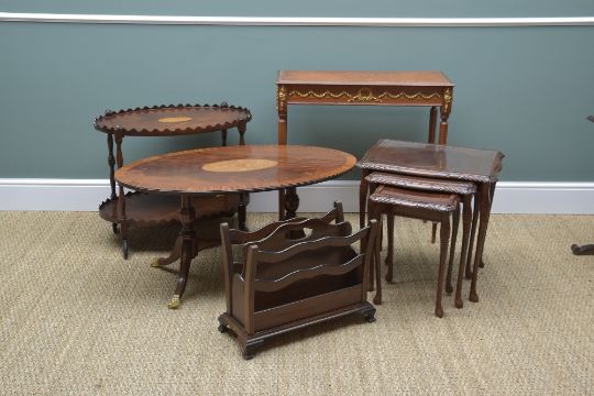 ASSORTED OCCASIONAL FURNITURE, comprising two-tier walnut trolley, oval cross banded coffee table, French-style side table, nest of occasional tables and magazine rack (5)