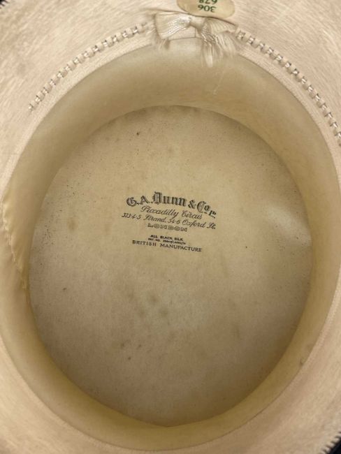 BOXED VINTAGE SILK TOP HAT, G.A. Dunn & Co (London), in cardboard box with lid bearing retailers details, interior 19 x 16.5cmComment: G-VG, with minor soiling to leather band, box dented and stained.The circumference is 54.5cm’s