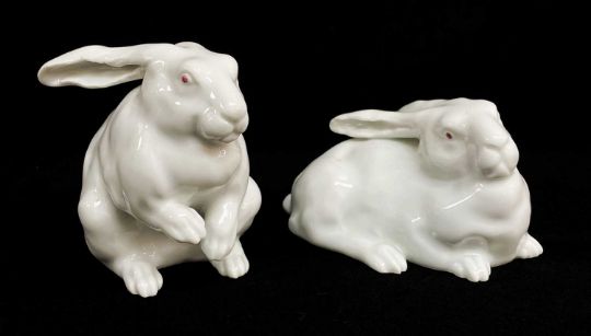TWO SIMILAR FUKAGAWA PORCELAIN HARES, one seated the other recumbent, impressed marks to bases (2)Provenance: private collection Swansea, consigned via our Carmarthen Office