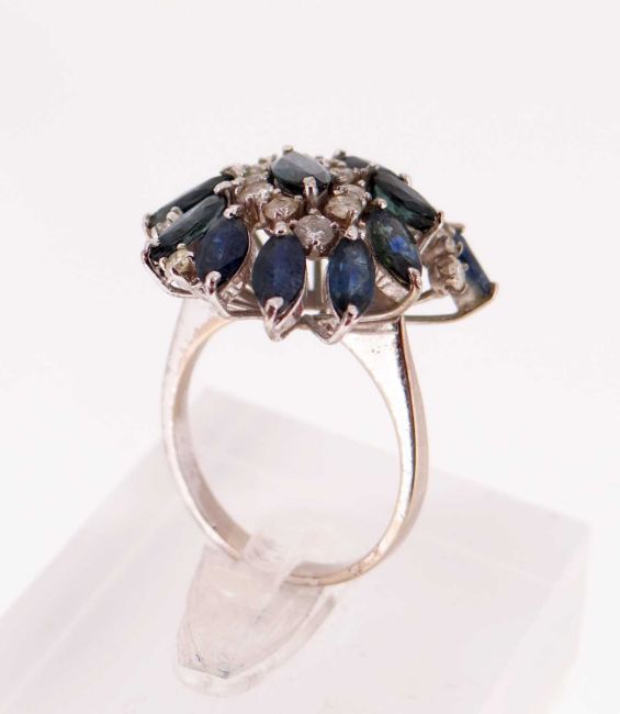 18K WHITE GOLD SAPPHIRE & DIAMOND CLUSTER RING of spiral design, ring size P, 6.8gms in square ring boxProvenance: deceased estate Carmarthenshire, consigned via our Carmarthen OfficeComments: good overall, all stones present, hallmark slightly rubbed
