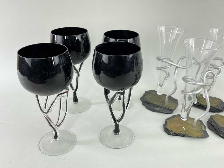TWO SUITES OF MODERN GLASS GOBLETS, including 6 'Celtic Flute' glasses with coiled metal stems and slate bases, 21cm h, and 4 Polish deep red glasses with branched stems, 21.5cms (10)