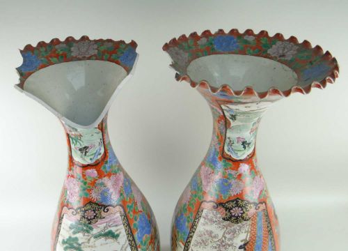 TWO PAIRS OF JAPANESE KUTANI PORCELAIN VASES, of pear shape with undulating flared rims, one pair with sinuous dragon in relief, 61.5 and 72cms high (4)