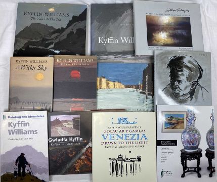 KYFFIN WILLIAMS RA BOOKS, gallery booklets and other collected ephemera, titles include 'Kyffin Williams Drawings', 'First Impression 2001' by Gomer Press, signed to the interior 'For Joyce with best wishes K Williams', other titles include 'Across the Straits', 'A Wider Sky', 'Kyffin in Venice', 'The Land and the Sea', 'Kyffin in Patagonia' and others along with a William Selwyn Paintbrush Poet with introduction by Sir Kyffin Williams 2007, ETC