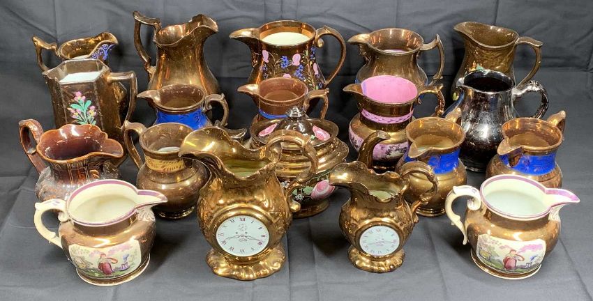 COPPERLUSTRE - a collection of various jugs, teapots, ETC.  Also, two copperlustre clock jugs and a pair of pink lustre jugs