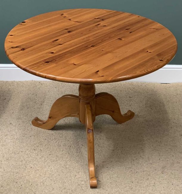FARMHOUSE PINE BREAKFAST TABLE having a circular top on tripod supports, 74cms H, 95cms diameter together with four spindleback chairs, 85cms H, 45cms W, 36cms D