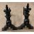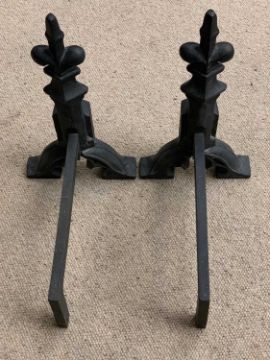 CAST IRON FIRE SURROUND, 108cms H, 87cms W, 13cms D and a pair of heavy cast fire dogs
