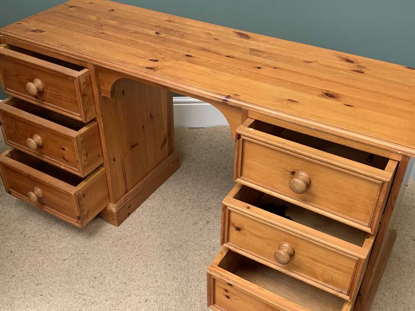 MODERN PINE FURNITURE to include two door wardrobe, 183cms H, 95cms W, 63cms D, dressing table, 69cms H, 138cms W, 44cms D, a square topped table, 77cms H, 69cms W, 69cms D and two farmhouse style kitchen chairs, 84cms H, 37cms W, 34cms D