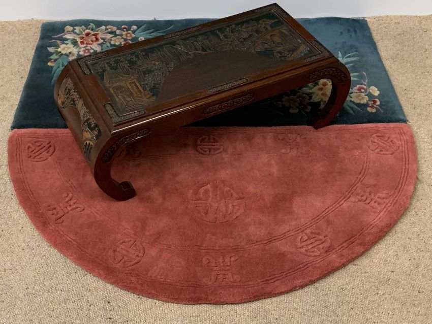 EASTERN CARVED COFFEE TABLE with bowed legs, 30cms H, 90cms W, 38cms D and two Ffrith Chinese washed rugs, 137 x 69cms