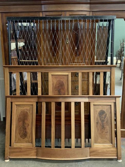 EDWARDIAN MAHOGANY BEDROOM FURNITURE comprising triple wardrobe with bow fronted central drawers and cupboards flanked by bevelled mirrored glass doors, inlay detail throughout, 214cms H, 215cms W, 65cms D, also a matching bed frame, 124cms H, 158cms W, 219cms D with spring base, dressing table with oval swing mirror, 178cms H, 137cms W, 60cms D and a pot cupboard, 83cms H, 40cms W, 38cms D