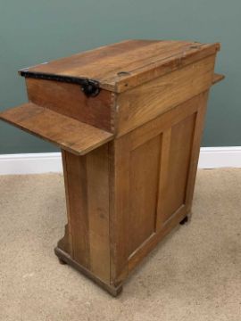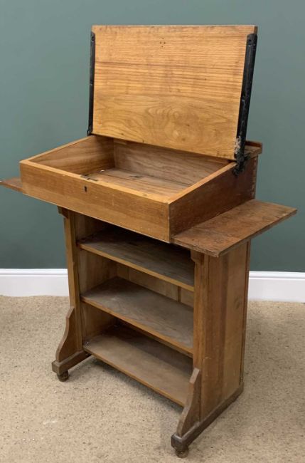 VINTAGE CLERKS TYPE LIFT-TOP DESK & ACCOMPANYING HIGH CHAIR - with foot step, 103cms H, 100cms W, 51cms D the desk, 105cms H, 34cms W, 30cms D the chair