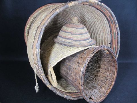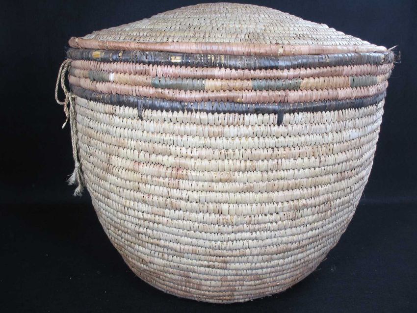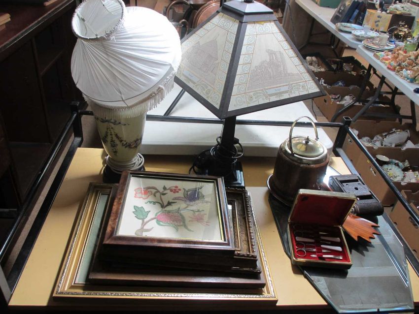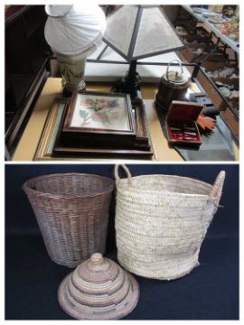 MIXED COLLECTABLES & HOUSEHOLD GOODS GROUP to include a bevelled edge wall mirror, two table lamps, a selection of pictures and prints, oak biscuit barrel, ETC and TRIBAL STYLE WOVEN BASKETS, a mixed quantity, 53cms H, 60cms diameter the largest