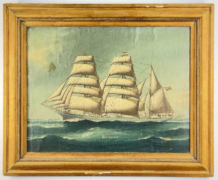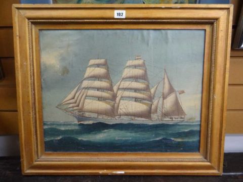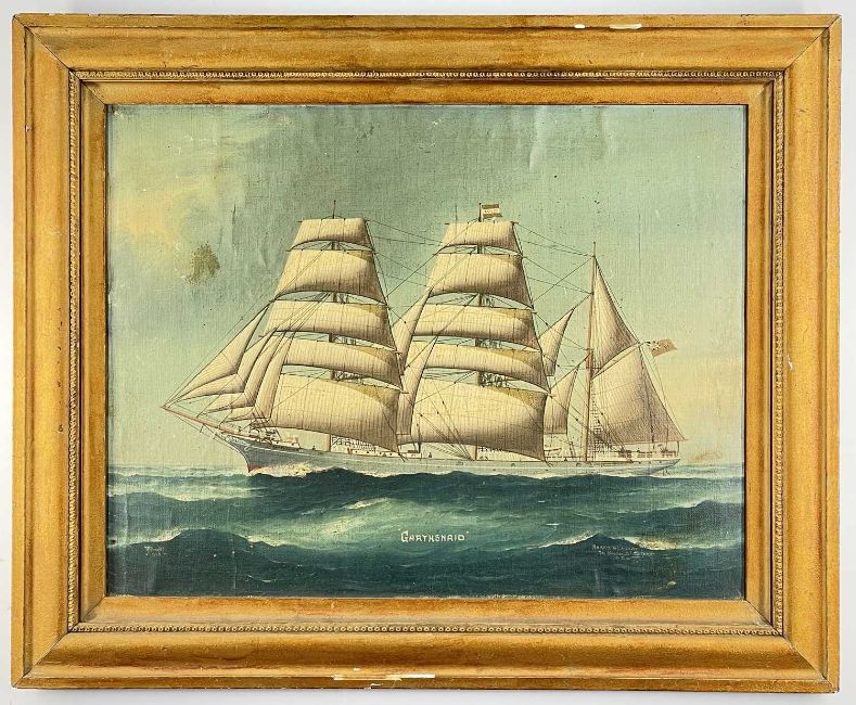 REGINALD ARTHUR BORSTEL (Australian, 1875-1922) oil on canvas laid to board - ship portrait of schooner 'Garthsnaid', titled, inscribed 'Harris & Laidlaw, 219 Sussex St, Sydney, N.S.W.', signed and dated 1920, 38 x 49cmComments: surface dirt, pin holes to margin