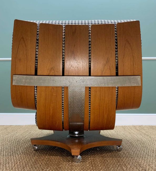 ANOTHER K.M. WILKINS FOR G-PLAN: 'HOUSEMASTER' ARMCHAIR, c. 1970, with chrome & teak slatted back, swivel platform base, later upholstered in black & white houndstooth materialComment: minor upholstery stains, inspection advised.