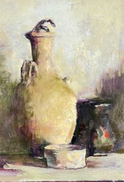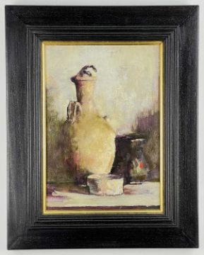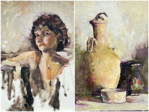 ROI SHAPIRO, two oils on board - still life of a pottery flask, 33 x 23cm; portrait of a lady, signed and dated '12, inscribed verso in the artist's hand 'For Barbara, ...', 39 x 31cm (2)