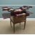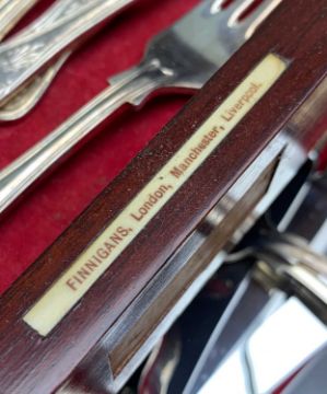 MAHOGANY 'PRESTO' PATENT METAMORPHIC CANTEEN TABLE, retailed by Finnigans (London, Manchester, Liverpool), foldout top opening to reveal cantilevered baize lined trays, and containing a harlequin 'Kings' pattern electroplated table service, comprising: 12 table knives & forks, 12 dessert knives & forks, 12 fruit knives, 6 each of gateau forks, soup spoons, dessert spoons, icecream spoons, teaspoons, coffee spoons, 3 table spoons and a sauce ladle