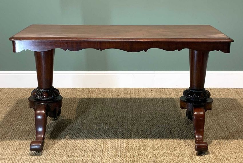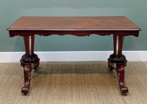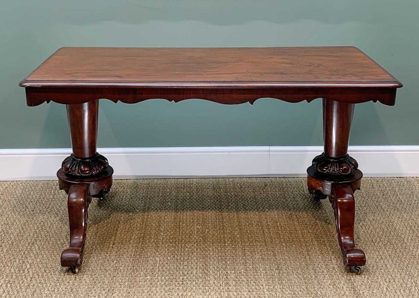 EARLY VICTORIAN WALNUT LIBRARY TABLE, moulded top above shaped fieze, tapering circular column supports and folate collars, cabriole legs, 137w x 70dComments: top scratched, frame loose