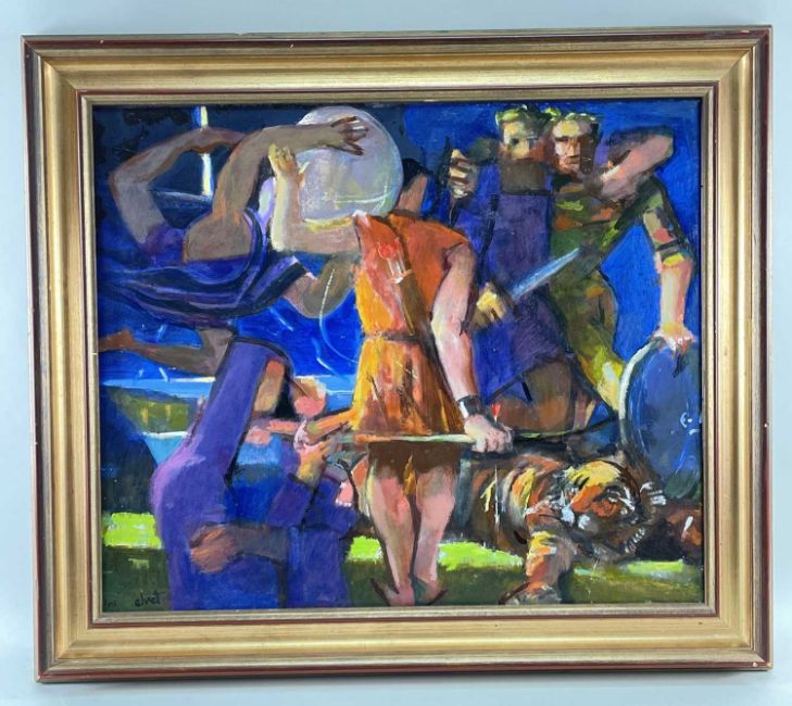 ELVET THOMAS oil on canvas - Greek mythology with Theseus, King of Athens, robed lady and slain tiger, entitled verso ‘Theseus and the Cave’, signed and dated 1995, 52 x 62cms