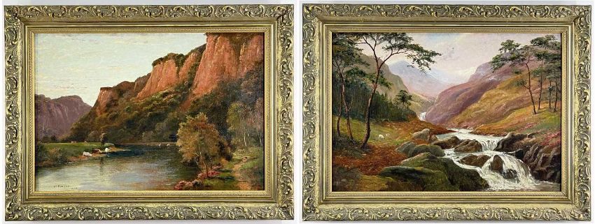 M. PORTER, oil on board, Cattle watering beneath a red cliff face, and a companion, signed and dated 1923, 34 x 49cm (a pair)