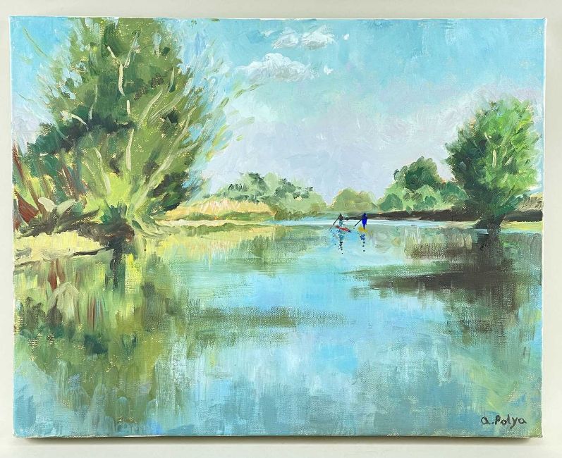 ANNA POYLA oil on canvas - entitled 'Paddleboarding on the Wye', 40 x 51cms