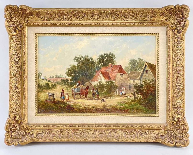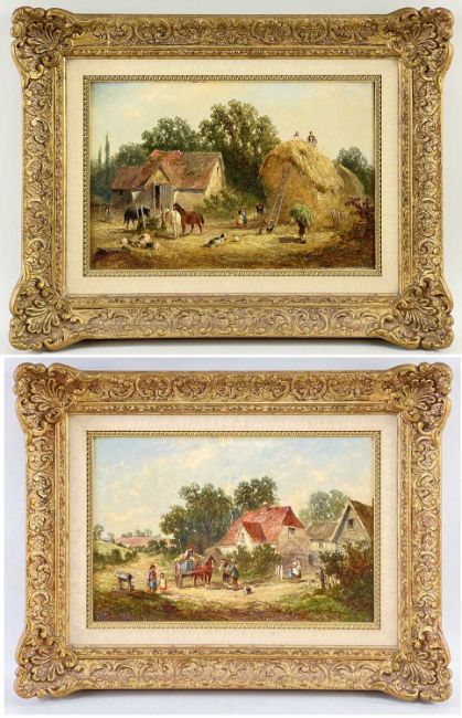 JAMES EDWIN MEADOWS (1828-1888) oil on canvas - Stacking Hay, and The Trumbel Cart, signed and dated 1868, 19 x 30cm (pair)Comments: 1st repaired tear, relined; 2nd paint flaking lower left over signature; both cleaned, stabilised, & reframed in Boudin frames.