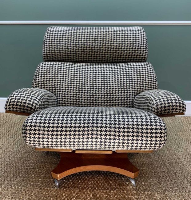 K.M. WILKINS FOR G-PLAN: 'HOUSEMASTER' ARMCHAIR, c. 1970, with chrome & teak slatted back, swivel platform base, later upholstered in black & white houndstooth materialComment: minor upholstery stains, inspection advised.