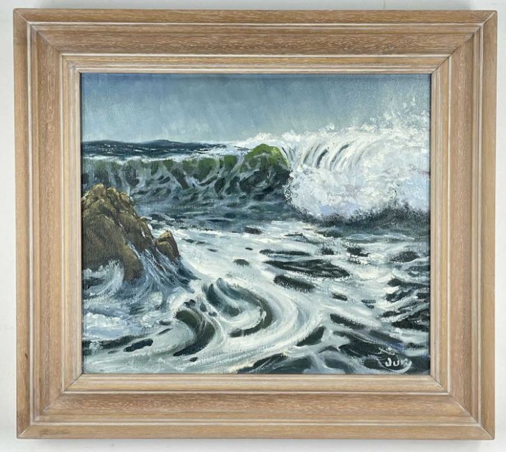 CAROLE JURY oil on canvas - entitled verso 'Rough Sea, Cold Da', signed, 35 x 40cms together with CAROLE JURY oil and collage on board - still-life of apples and vessel, entitled verso 'Copper Cream Can', signed, 30 x 23.5cms (2)