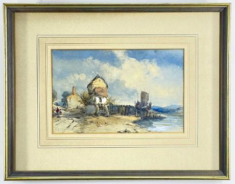 FOLLOWER OF DAVID COX, watercolour - riverbank with cottages and figures, signed with initials, 'GJK' lower left,17.5 x 27.5cm