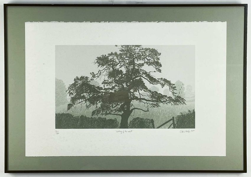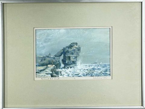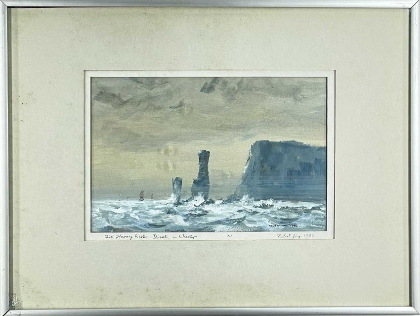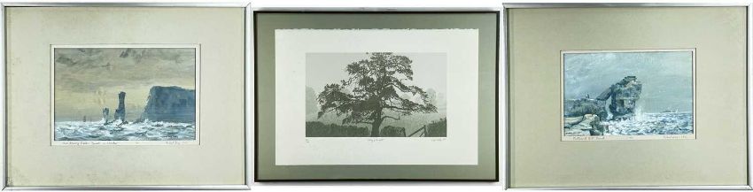 ROBERT HAY, gouache - Portland Bill, Dorset, and Old Harry Rocks, Dorset, in Winter, signed and dated 1982/3, 15 x 23cm; and CHRIS NOBLE, limited edition (12/40) lithograph - Lifting of the Mist, signed, titled, numbered and dated 1985 in pencil 20 x 34cm (3)