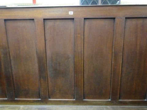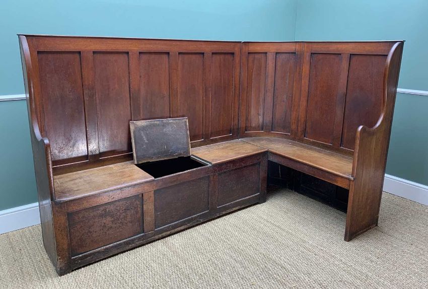 JOINED ELM CORNER SETTLE, c.1800, panelled backs above box and open seat sections, 214 x 123 x 139cms h