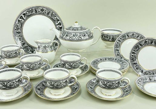WEDGWOOD 'FLORENTINE' PATTERN TEA SERVICE, comprising seven tea cups, eight saucers, six side plates, milk jug, sugar basin, tea pit, bread and butter plateComments: one saucer cracked