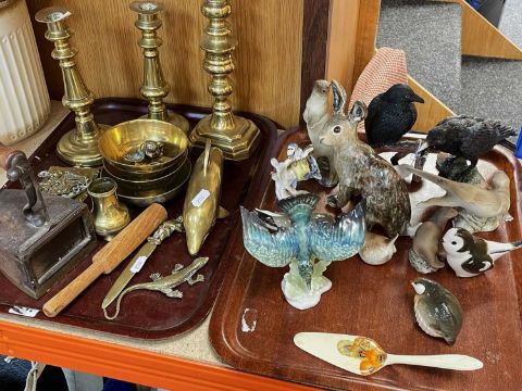 CHARITY LOT: ASSORTED DECORATIVE ORNAMENTS, COLLECTIBLES & A WRISTWATCH, including heavy copper sauce pans, brass candlesticks, weights, china animal fiures, West German pottery, Tottenham Hotspur memorabilia, programs and books, 'Crickette' parlour game, Godfrey Evans cricket game, cricket memorabilia, Steiff 'Rocky' mountain goat toy, 1966 World Cup Willie duffel bag, South American wocen hammock, and a boxed Eterna dress watch, etc.