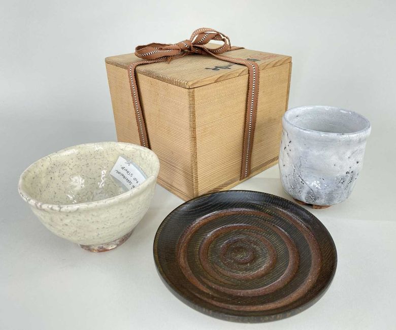 JAPANESE STONEWARE TEA CEREMONY WARES, 20thc, including set of 6 Kyoto 'mushroom' dishes, 12cm d. in hinoki wood box; Kyoto Seto chawan with cream glaze & wood stand, 10cm diam; and Kyoto tall chawan with pale grey glaze, 8.5cm h (8)