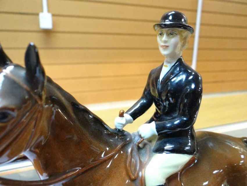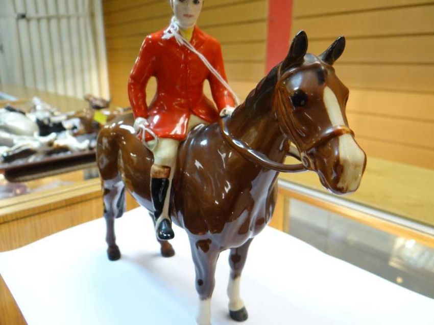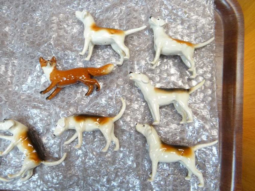 BESWICK FOX HUNTING GROUP, comprising two huntswomen on grey and bay horses model no. 1730, huntsman on bay horse, model no. 1501, fox model 1440, and 4 pairs of foxhounds (12)