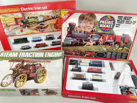 FOUR BOXED TOY SETS, including Hornby R541 GWR electric Freight Set, another similar lacking carded info, Timpo Prairie Rocket Hold-Up set, and Bandai Steam Traction Engine constructor set (4)Comments: generally G-VG, boxes F-VG, contents not gaurantedd complete.
