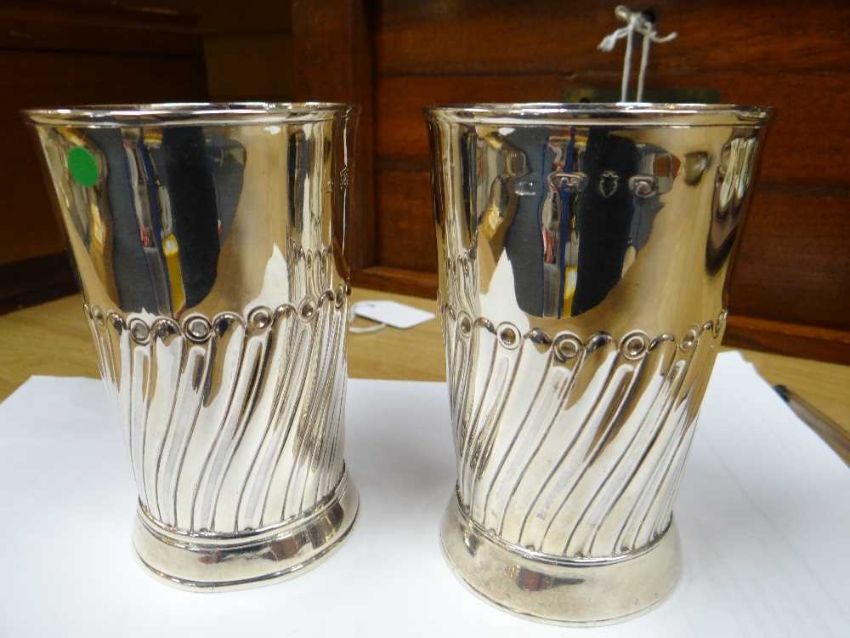 PAIR GEORGE III SILVER BEAKERS, London 1817/1818, half wrythen fluted, on flared circular feet, 11.5ozt,12cm h (2)