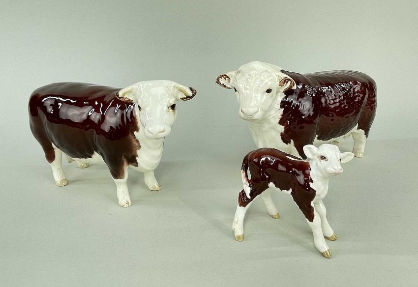 BESWICK HEREFORD CATTLE, comprising Hereford Bull Ch. of Champions (1363B), Hereford Cow Ch. of Champions(1360) and Hereford Calf (1827) (3)