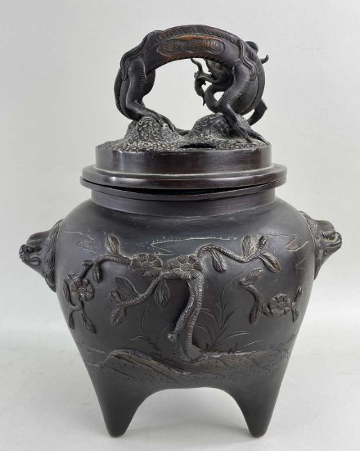 JAPANESE BRONZE KORO & COVER, Meiji Period, bulbous tripod form with shishi mask handles, sides cast in relief with a monkey clasping a peach beneath a fruiting peach tree, reversed with a flowing tree, pierced cover, handle in the form of an arched dragon on rockwork, 27cms high